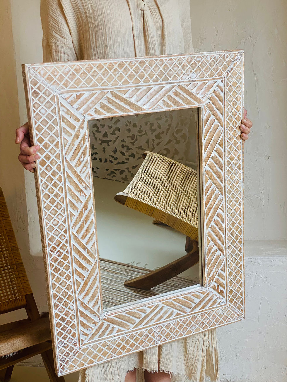 El Oyması Ahşap Pencere Ayna / Vintage yeşil ya da Naturel